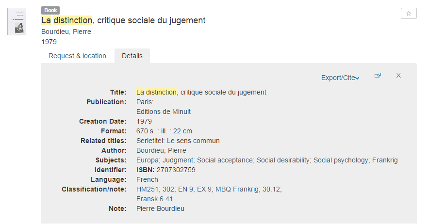 … we know that Pierre Bourdieu is the person that wrote a book called La Distinction, because his name is mentioned as Author on the record for this book. We also know a whole lot of other things just from looking at this record, because we are able to infer from context.