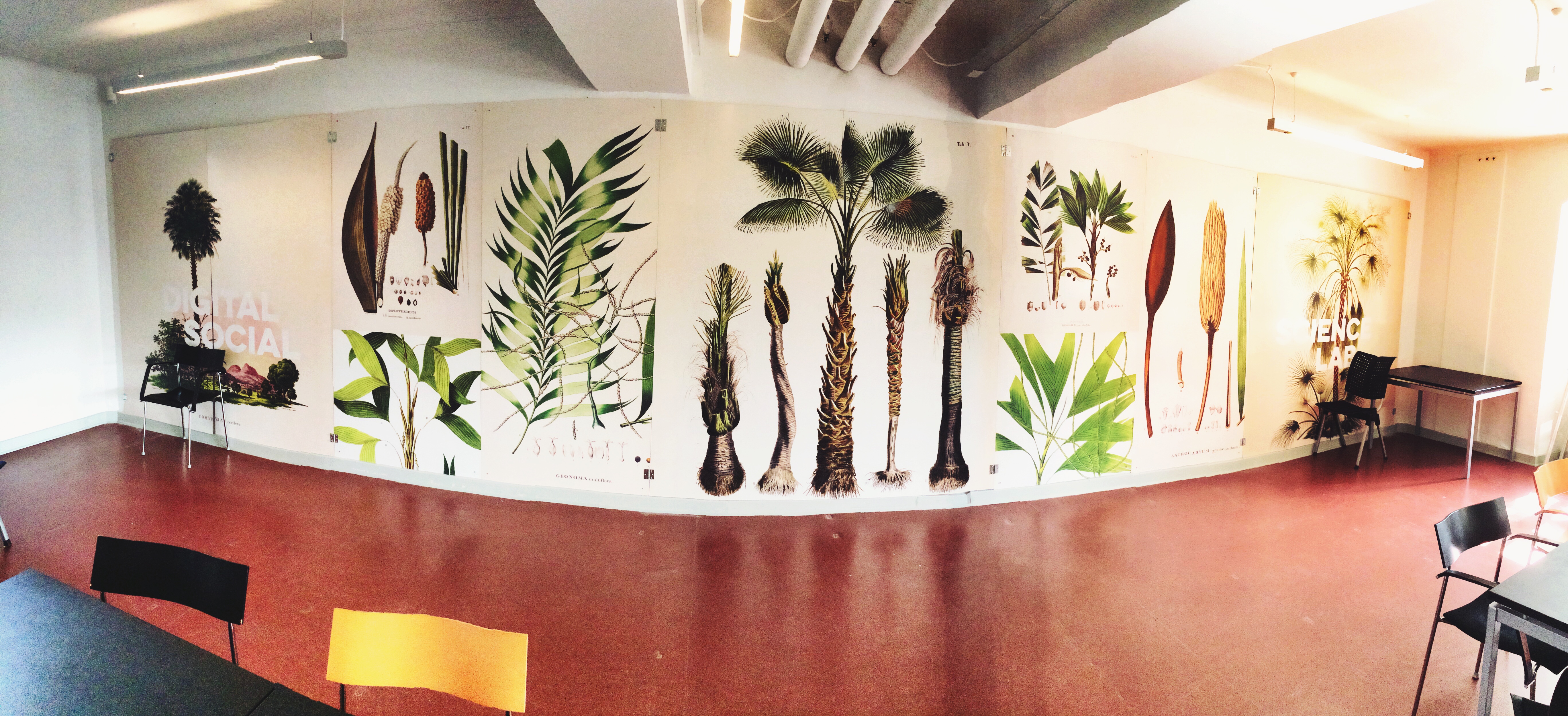 From the beginning we wanted the lab to have some kind of visual identity. I talked to good library pal and graphic ninja on my LIS journal REVY, Henrik Dybdahl, and he suggested a palm theme… ‘palms is really hot these days’ he told me. I like palms very much but I wanted something that lasted longer than hot of the week and my first association with the palms in the lab was the music video to WHAM! hit Club Tropicana and I was not sure that was the right match for our work with digital tools. But then we saw some sketches Henrik made and it look so classy and awesome and we realized that the palm connection was pretty valid since the faculty library is located in the old Botanical Laboratory right next to Botanical Garden and The Palm Wall was a reality. We got it put up just last week and it looks like this in panorama: