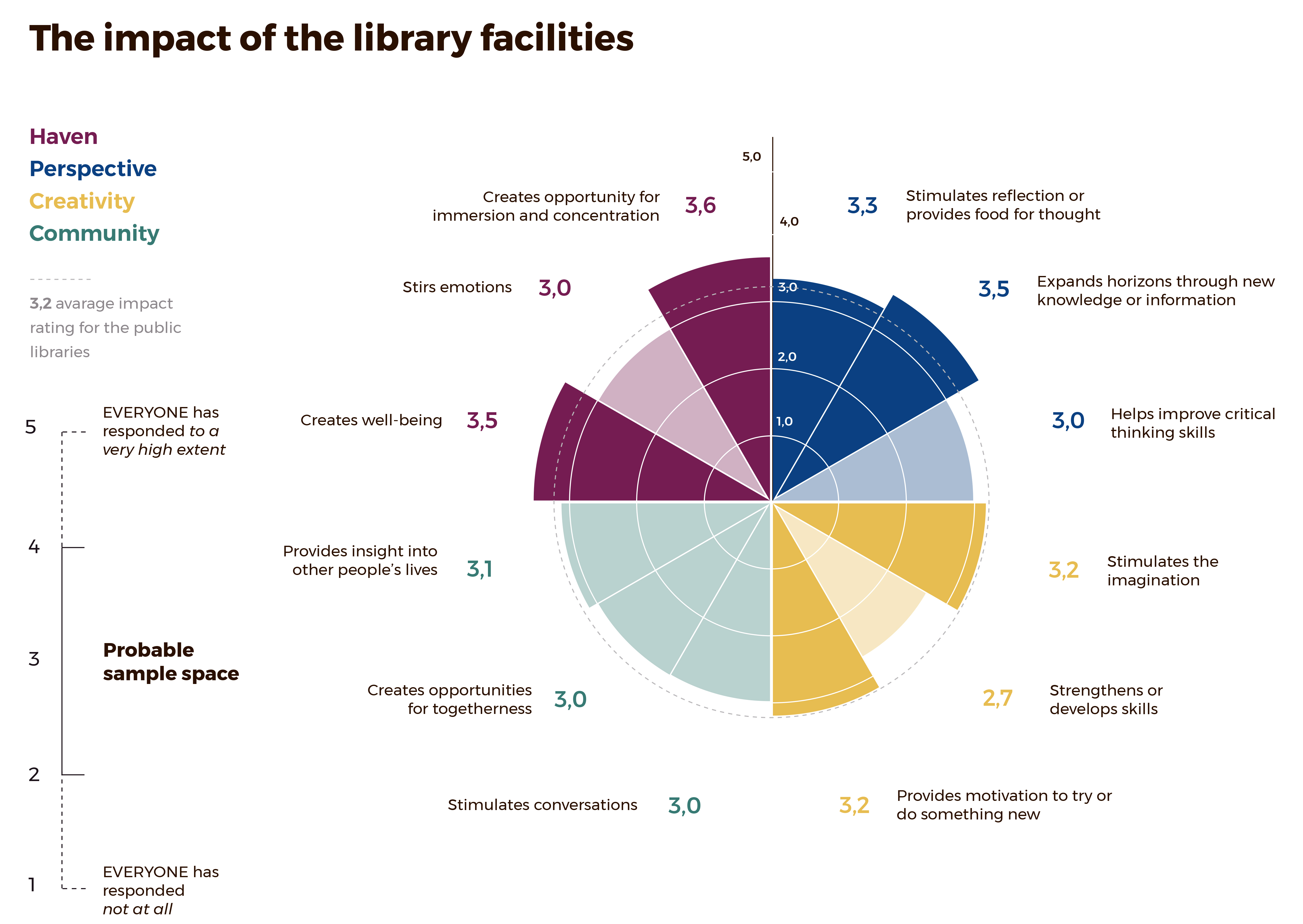 These parameters can be changed to suit the context you work within. If, for example, you need to develop an activity targeted at senior citizens, the dimension “Creativity” may have a different character than in the case of primary school students. To meet this difference, one must adjust the individual parameters under each dimension of impact according to the situation. The basic structure of the Impact Compass – the four dimensions – should in turn be retained in all the contexts in which you use the compass. It will contribute to the gradual development of a common language on the impact of the public library. At the same time, the four dimensions are rooted in research, which gives the tool a strong methodological foundation.