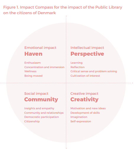 1. The extended conversation: You can use the Impact Compass to add more details to the conversation about the public library’s impact on users, with politicians, administrations, partners, etc. – for example in connection with library strategies, communication strategies, construction of new library buildings or development of new goals and visions for the local public library’s activities and development.